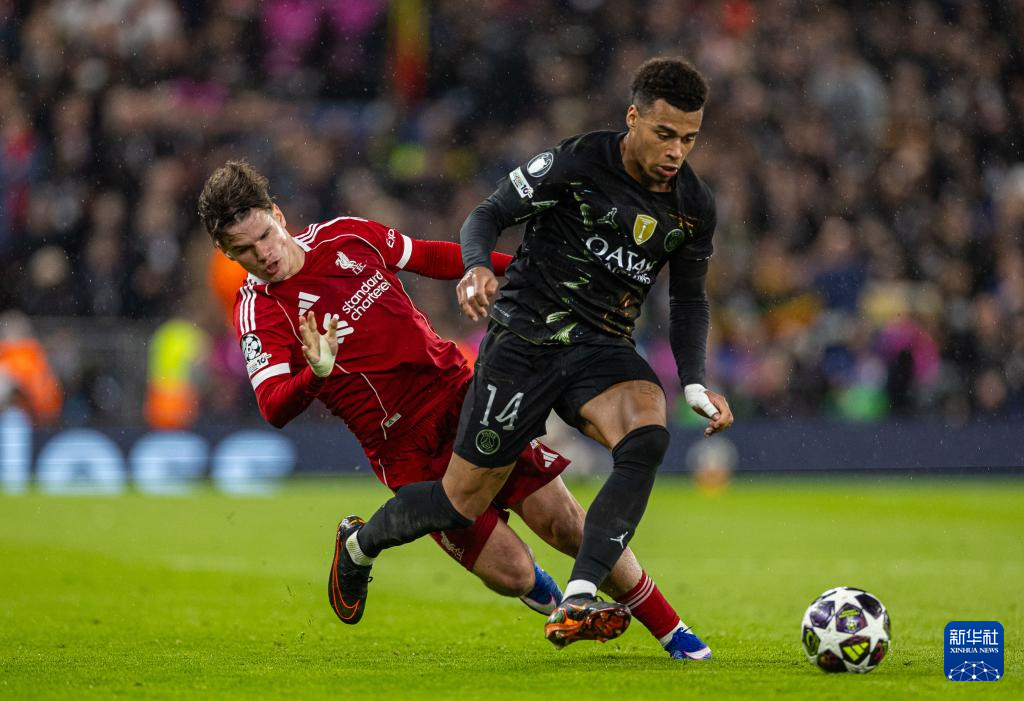 利物浦球员凯尔凯兹(左)与巴黎圣日耳曼球员杜埃拼抢(图据新华社)